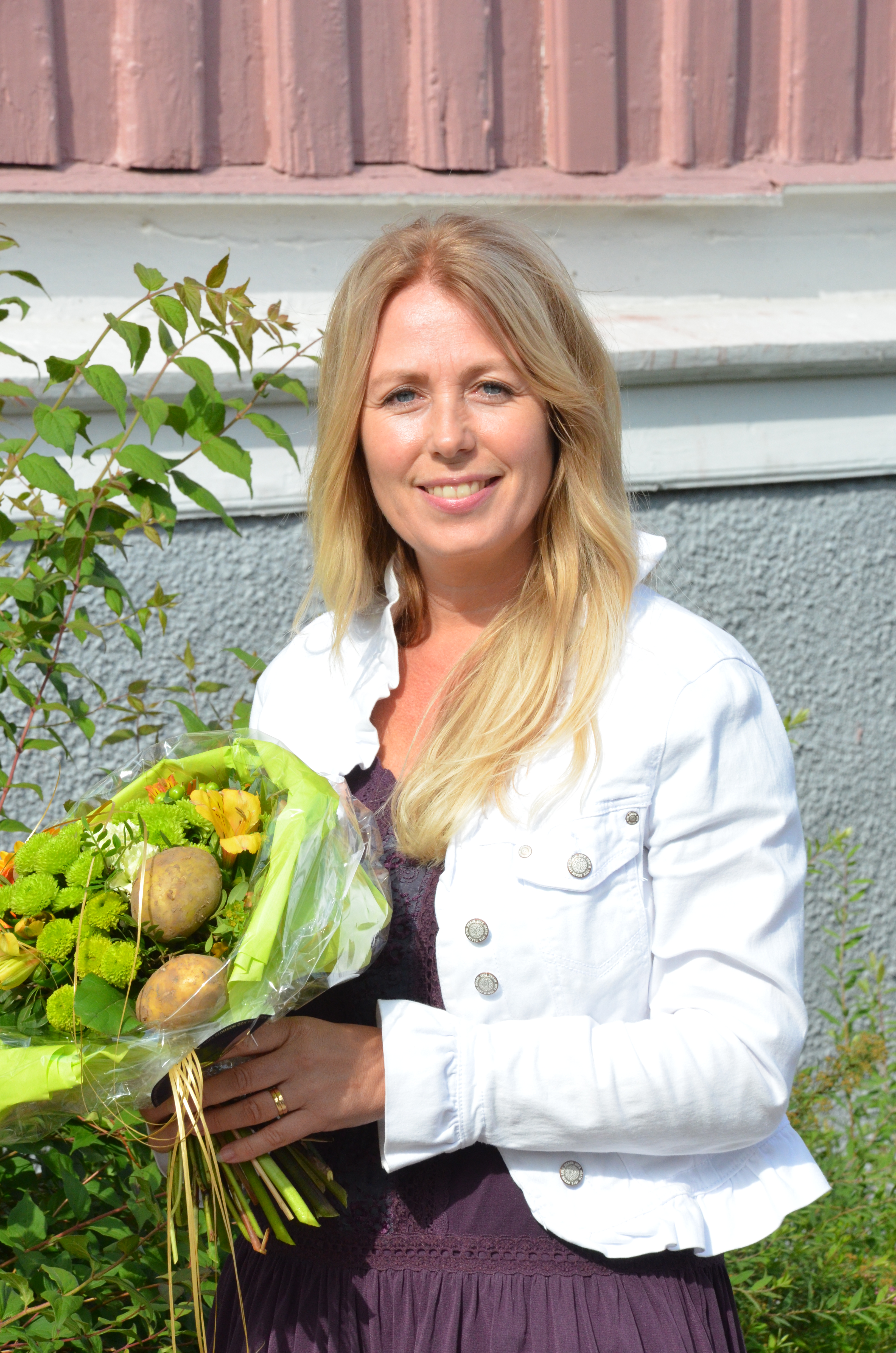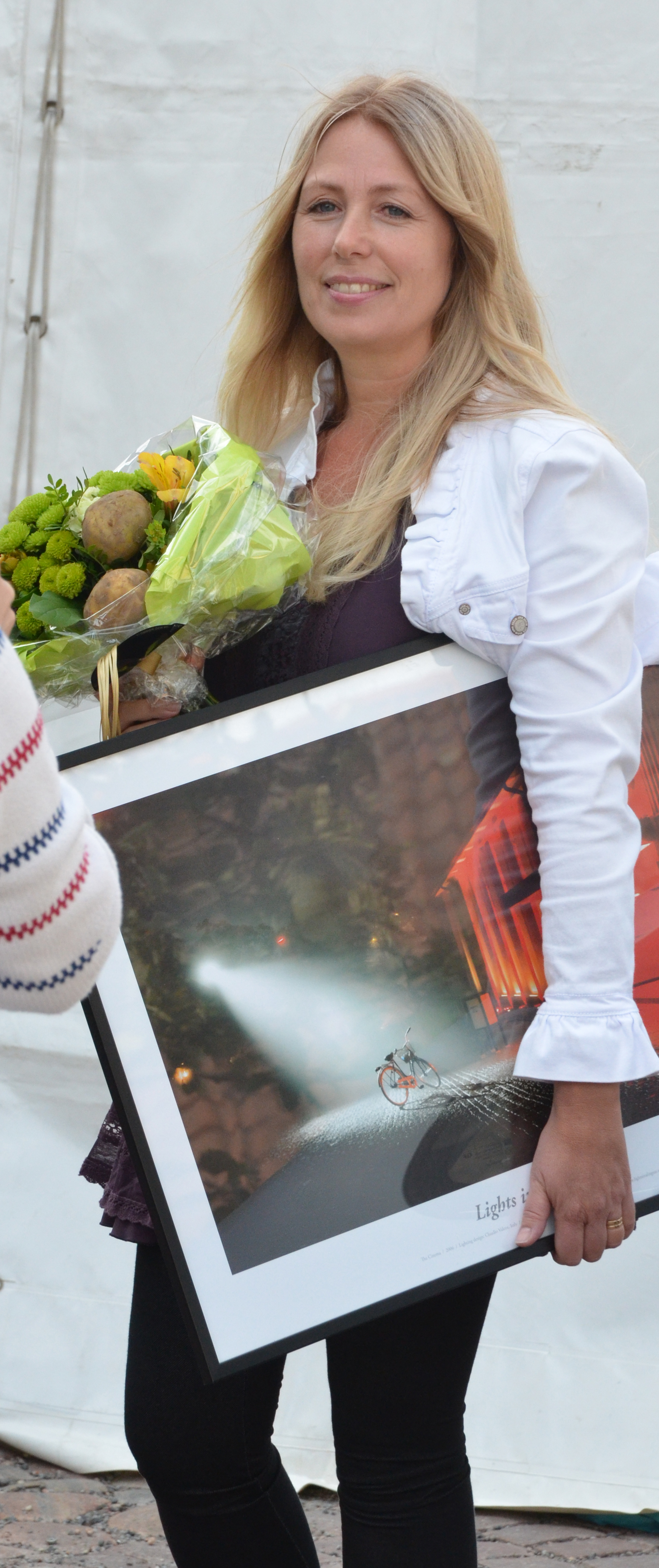 Susanne MacFie med bukett och tavla vid prisutdelningen den 17 juni 2011. Japp, det var länge sen...